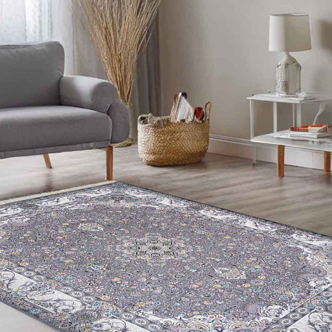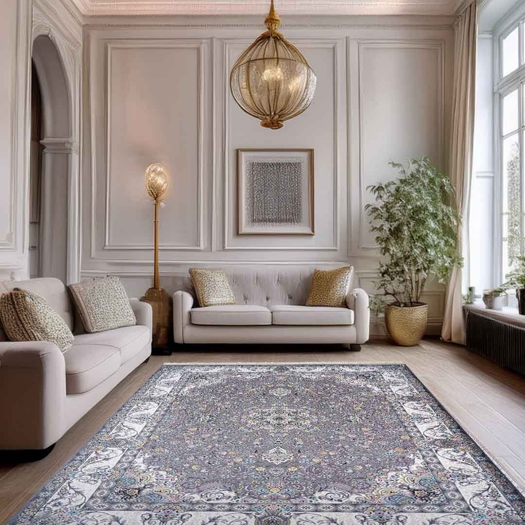 Soften your space with the Amatis Pargol Light Grey Rug. A gentle light-grey field is filled with scrolling vines and petite florals, centred with a detailed medallion and framed by layered borders in grey and ivory. Subtle accents of teal, rose and gold add quiet colour while the overall look stays calm and easy to style.