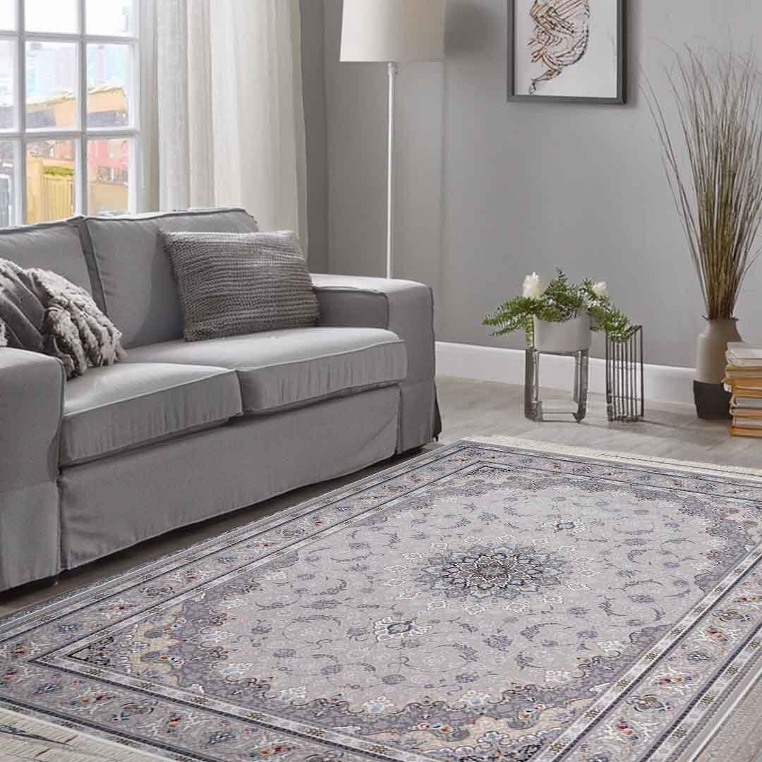 Lighten your space with the Emerald Mahan Cream Rug. A soft cream field frames a finely detailed floral medallion, surrounded by layered borders in grey and ivory with subtle blue and warm stone accents. The gentle palette adds definition without dominating the room, making it easy to style with modern or classic décor.