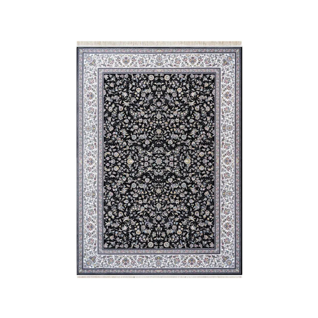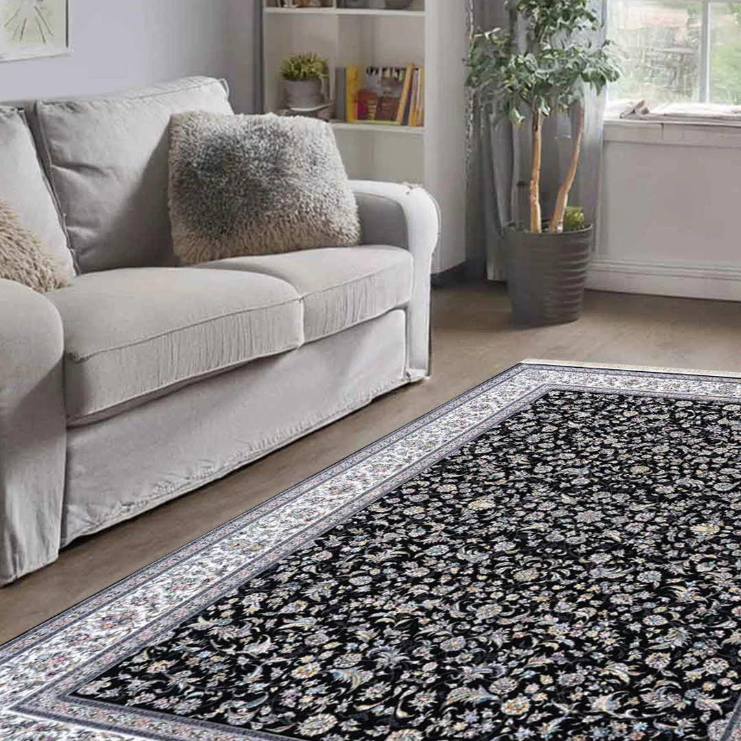 Give your room rich depth with the Amatis Adrianna Navy Blue Rug. A dark navy field is filled with an all-over pattern of scrolling vines and petite florals, framed by layered borders in soft grey and ivory with delicate pastel highlights. The refined palette grounds a space while the intricate design adds movement and character.