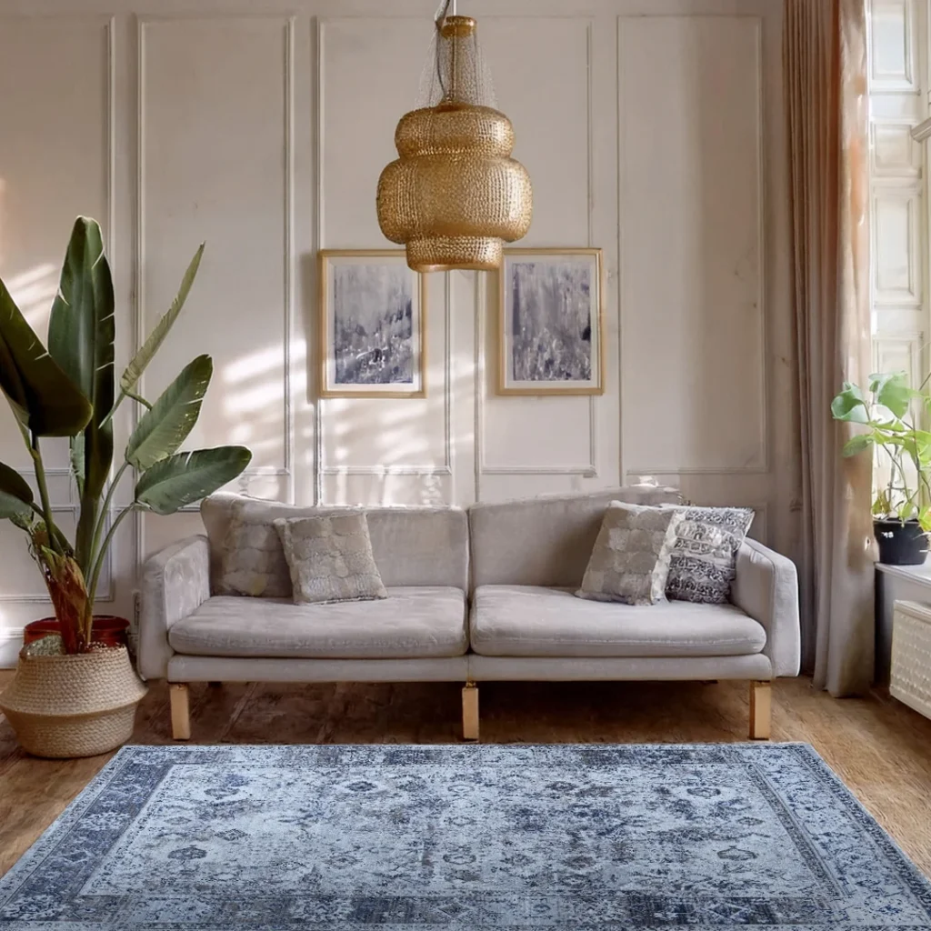 Place it in front of a two-seater sofa or under a coffee table to define the seating area. Positioning the front legs of furniture on the rug helps create a balanced, cohesive look.